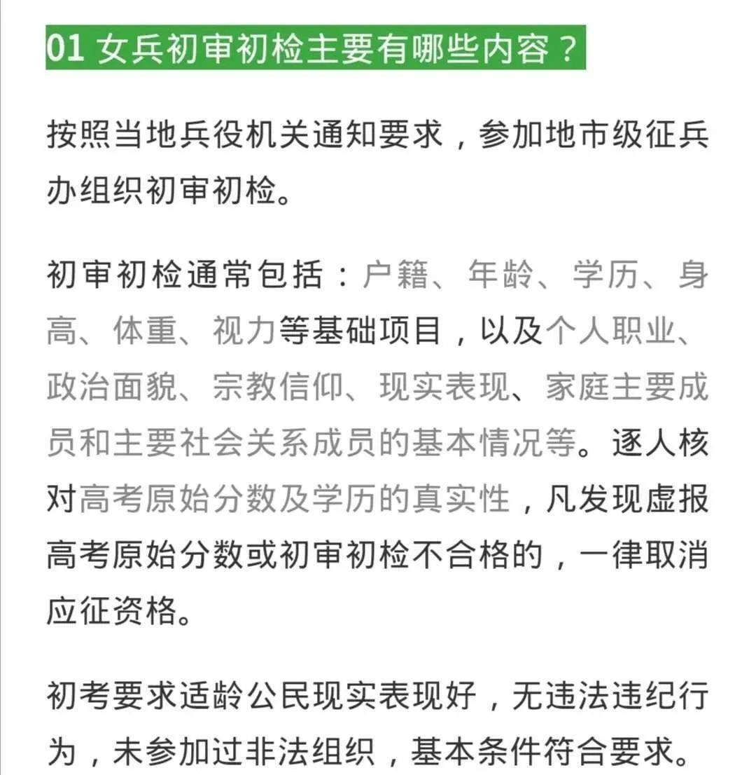 4、问:参军前的检查需要空腹吗?答:参军前的检查可能需要空腹进行,特别是实验室检查,如血常规、尿常规等,建议女性在检查前咨询医生并遵循医生的建议,女子当兵前需要做全面的健康检查,以确保身体状况适合接受军事训练和执行任务,女性应该了解并遵循相关的注意事项和常见问题解答,以确保检查的准确性和有效性,希望本文能为想要参军的女性提供一些有用的信息和帮助。