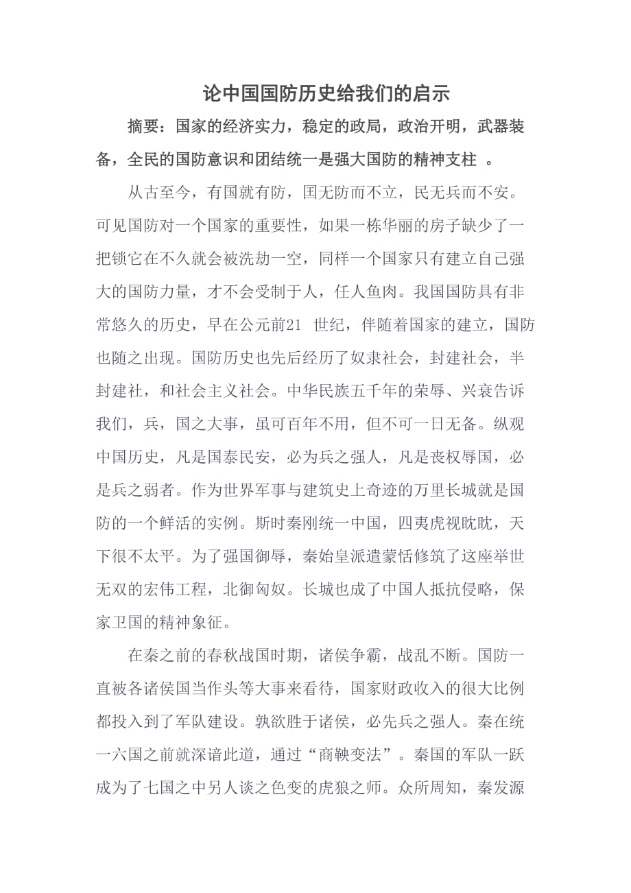 国防是国家生存与发展的保障,是国家安全的重要组成部分,中国自古以来就有着悠久的国防历史,经历了多个阶段的发展,通过对中国国防历史的研究,我们可以得到许多宝贵的启示,为当今的国防建设提供有益的参考,本文旨在探讨中国国防历史阶段的启示,以期对我国的国防事业发展有所裨益。