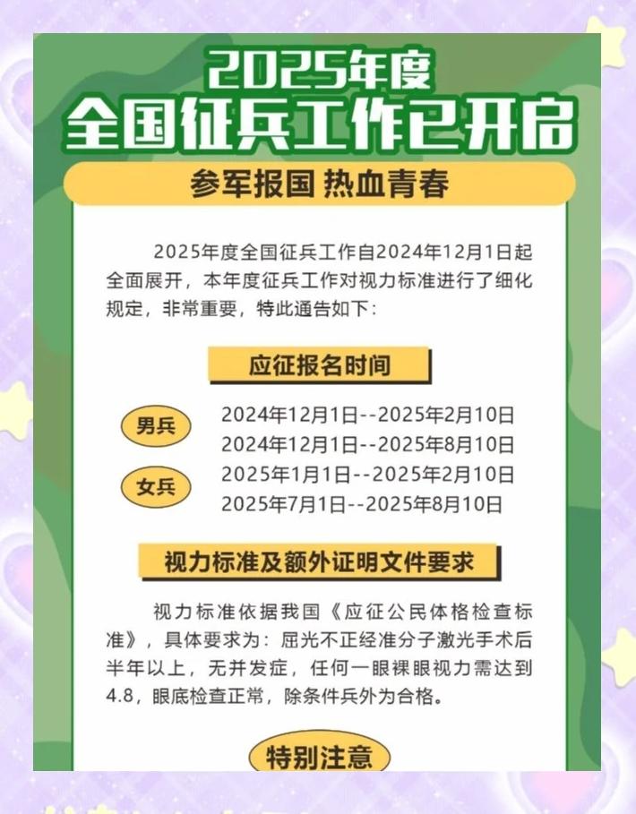随着时代的变迁和军事技术的不断发展,军队对士兵的素质要求也日益提高,视力作为士兵身体素质的重要组成部分,其标准在征兵过程中一直受到严格把控,本文将详细介绍关于即将到来的2025年征兵入伍的视力要求,并对其进行深度解析,以便广大有志青年及其家长更好地了解相关标准,做好入伍准备。