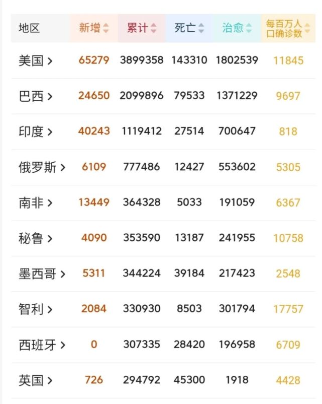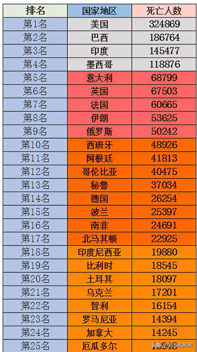 全球新冠疫情死亡人数排名