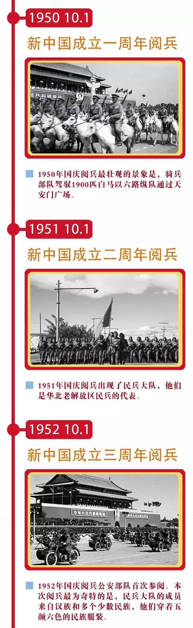 2、建国周年阅兵:自1950年起,每逢国庆周年,我国都会举行盛大的阅兵仪式,至今已举行了多次国庆阅兵。