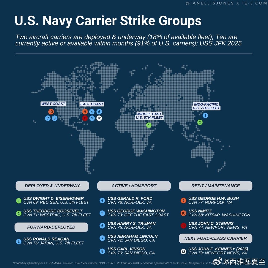 美国航母在全球范围内的部署涉及多种战略意图,展示军事力量,维护美国的全球地位和影响力,维护美国的战略利益,包括能源供应线、贸易路线以及地缘政治关系,通过与盟友的联合演习和军事合作,共同应对潜在威胁和挑战,通过航母部署向潜在对手施加压力,以维护美国的国家利益和安全。